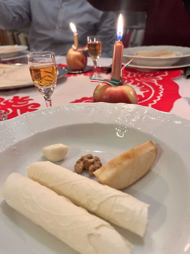 Megérkezésünkkel egyidejűleg természetesen éppen időben tesszük fel a kérdést, hogy mit segíthetünk… Amikor már csak a terítés marad hátra. Pontban ötkor elmondjuk az asztali áldást, rápergetjük a mézet az ostyára, elmajszoljuk a felcikkezett almát a családi egységért, a fokhagymát a jó egészségért, a diót az eszünk karbantartásáért. Még trikolor szalaggal díszített gyertyát is gyújtunk asztaldíszként, pedig az utóbbi időben volt, amikor nem csak a gyertya égett…
